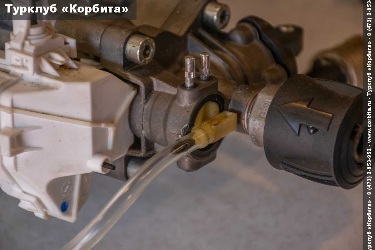 Перед началом работ необходимо отключить устройство от электросети и убедиться, что внутри отсутствует вода. После этого разобрать корпус, снять хомут. Клапан находится под пластиковым колпаком. На данном этапе можно проверить, функционирует ли клапан. Если нет, следует его вынуть. Для этого надо открутить колеса, разделить корпус, раскрутив 4 шестигранных шлица, снять блок электроники. Затем раскрыть нижнюю часть устройства.