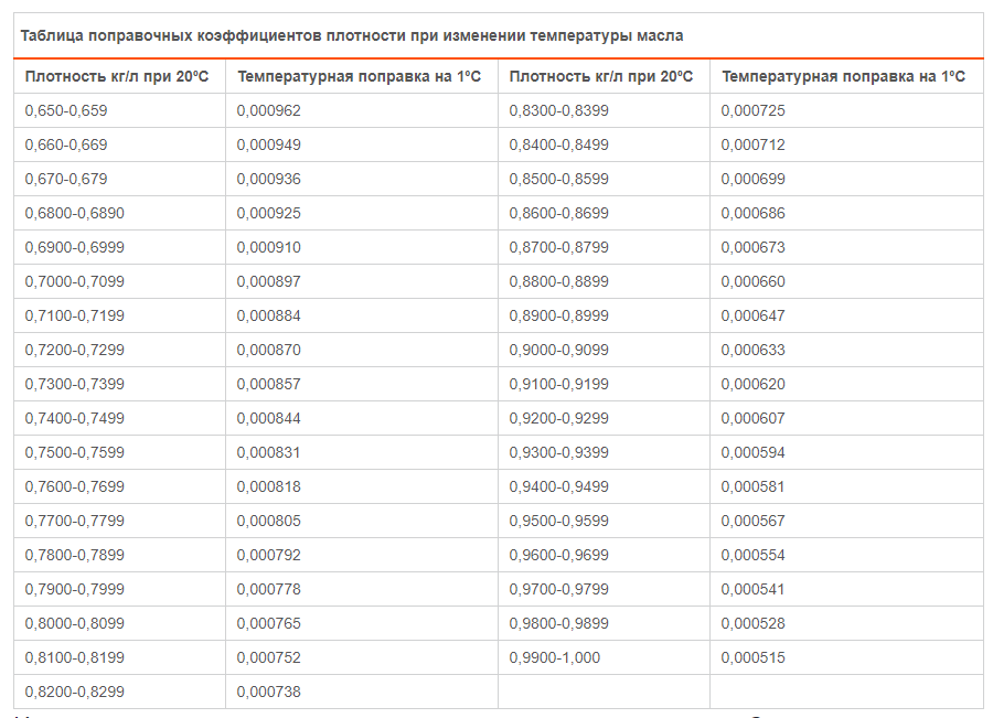Коэффициент поправки при изменении на один градус от лабораторного значения, отдельно взятого масла с известной плотностью, будет отличатся и варьироваться от 0, 000867 при плотности 0,739 кг/л до 0,00062 с плотностью 0,915 кг/л.