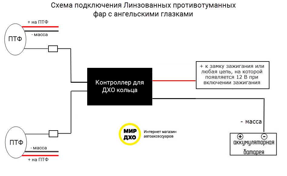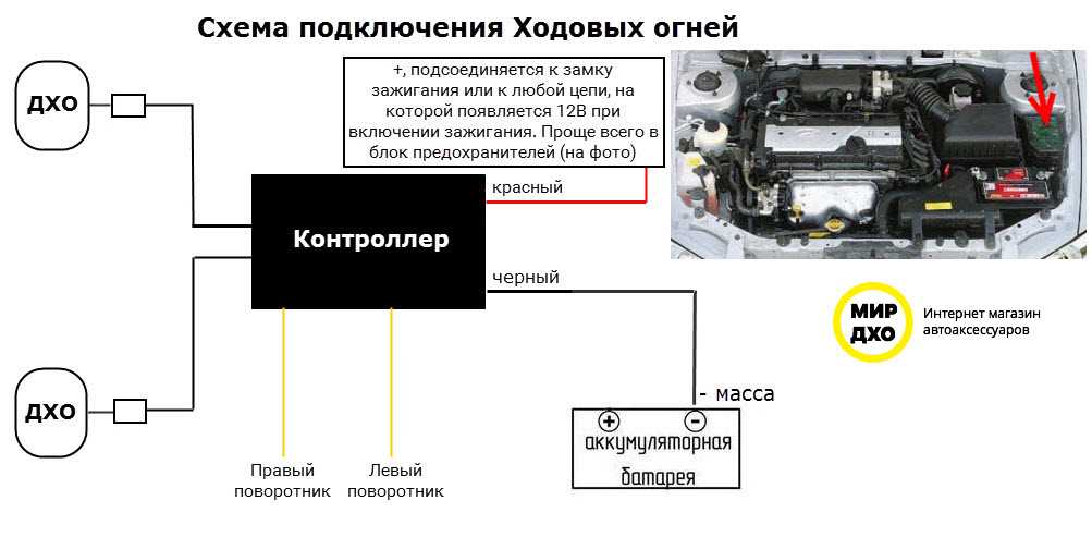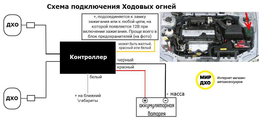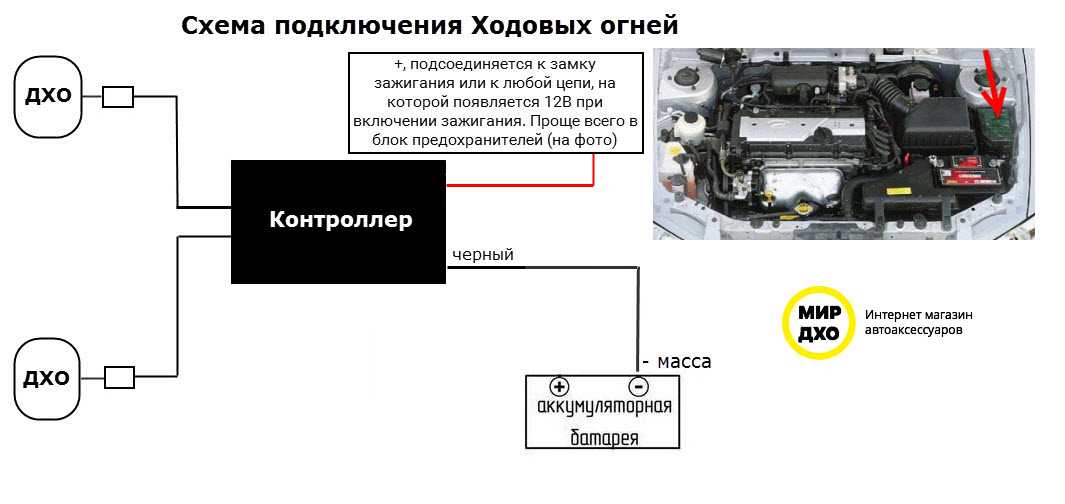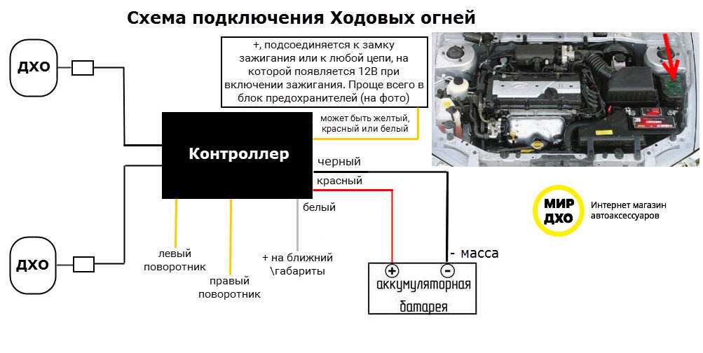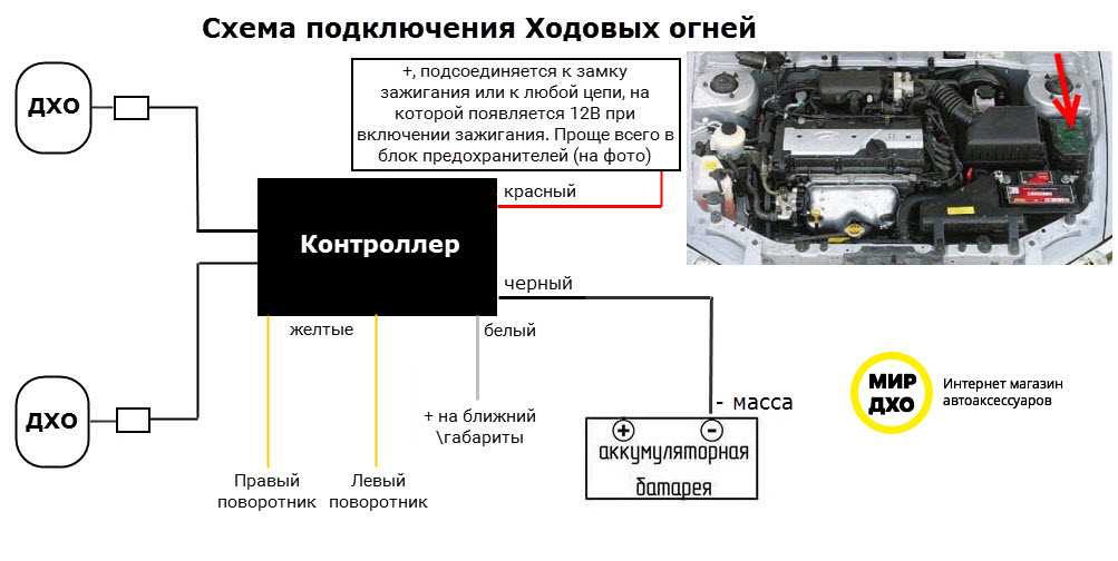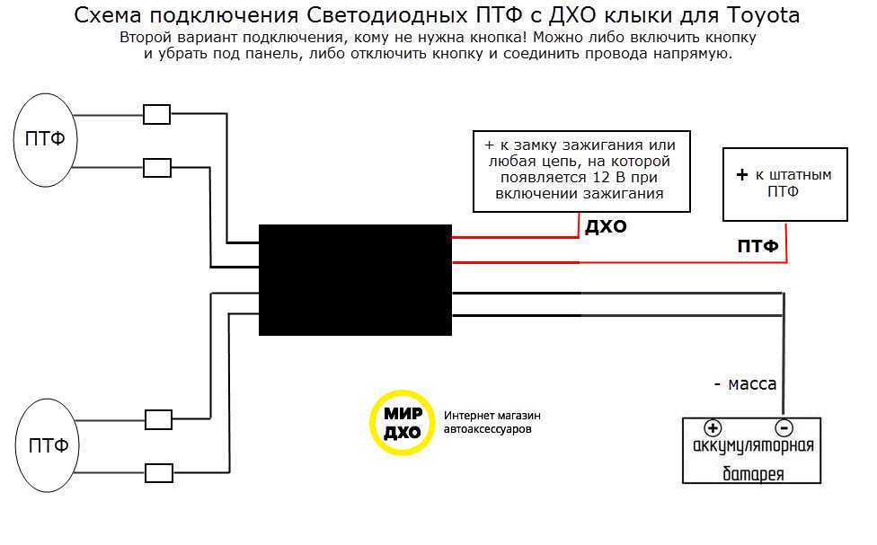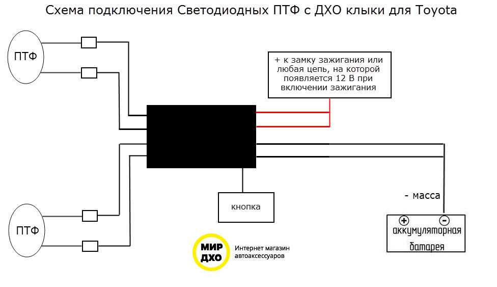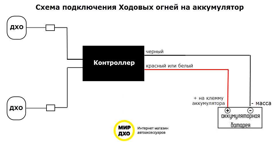 2. Схема отключения любого комплекта ДХО. На схеме указан только провод, который подключается на 12В зажигание! Он назван на схеме, как «красный провод».