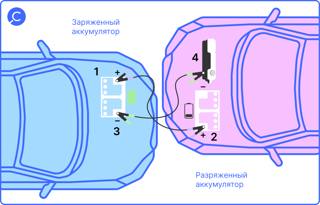 Чтобы перестраховаться, лучше сначала накинуть провода на автомобиль, который обесточен. Если вдруг вы всё-таки перепутаете полярность и автомобили между собой перемкнёт, ничего критичного не случится.