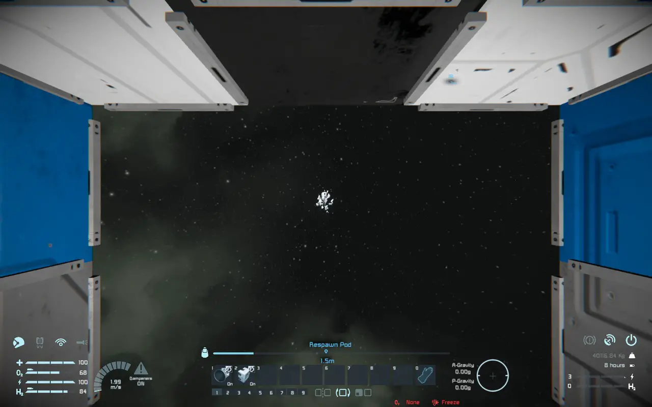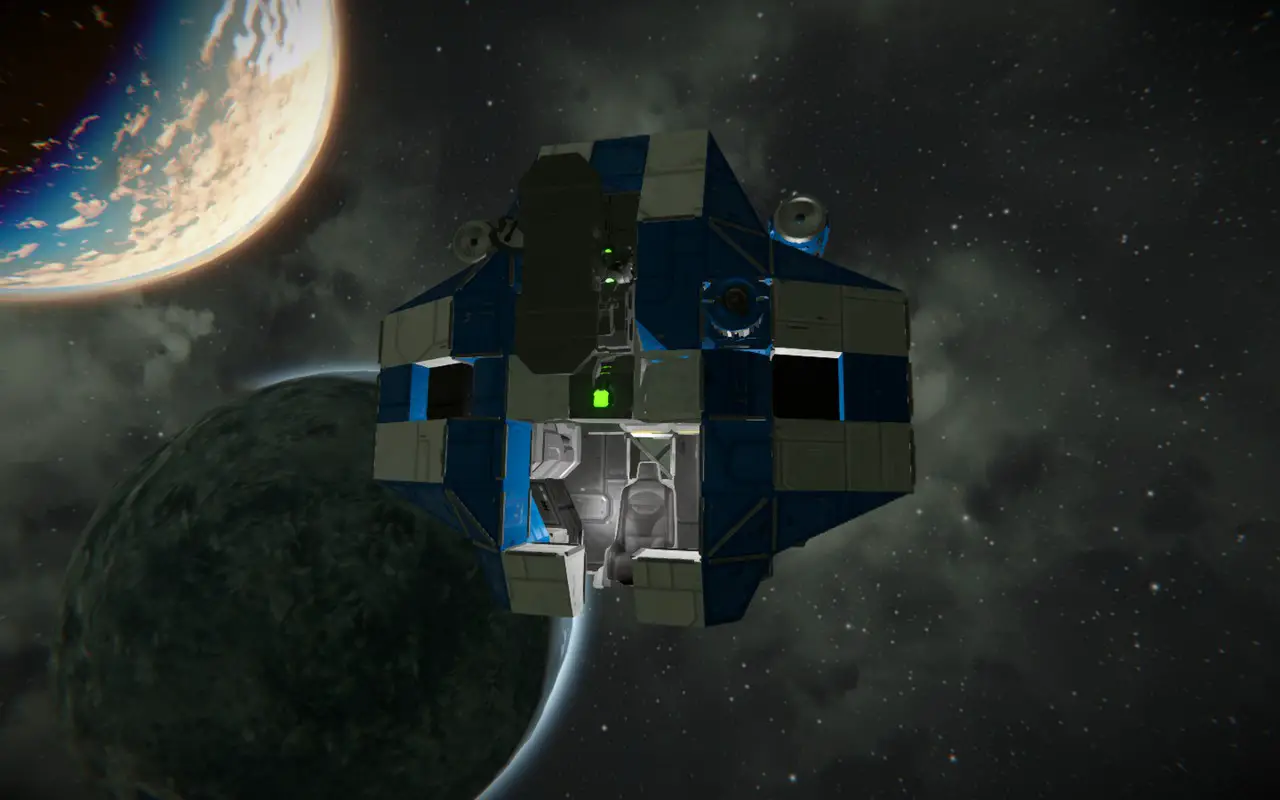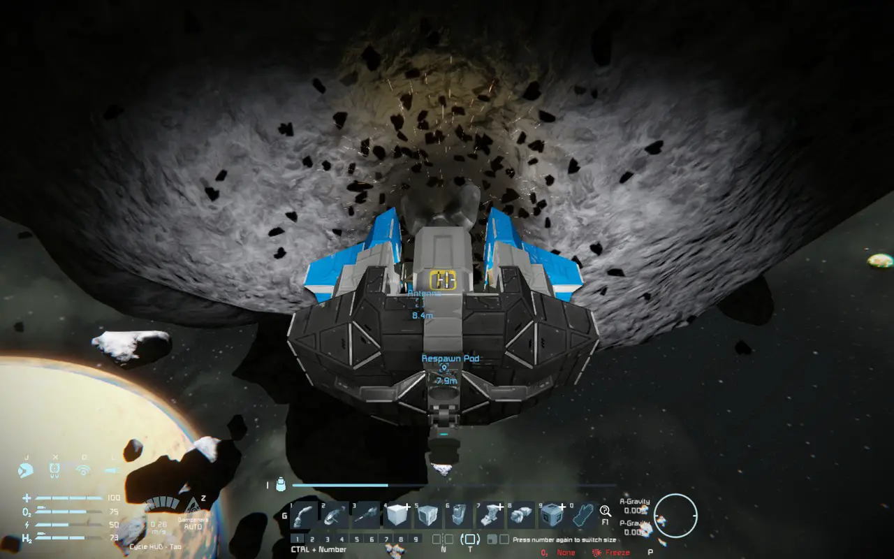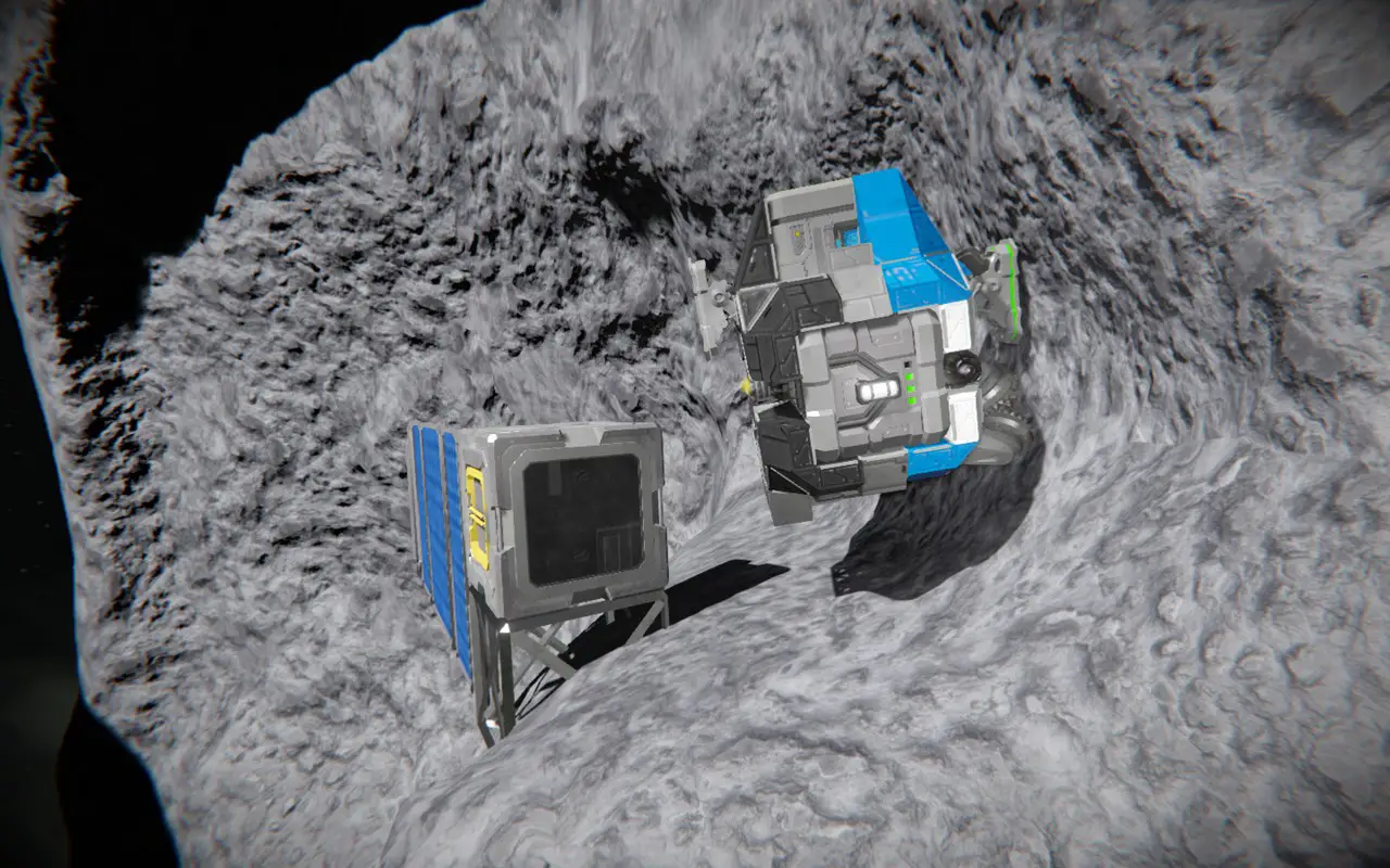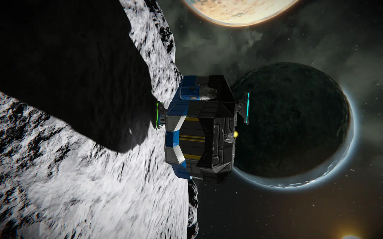 Как только гравитация спадет, переключитесь на вид от третьего лица и визуально определите местонахождение ближайшего астероида. После того, как вы идентифицировали астероид, отключите двигатель, используя гироскоп для вращения капсулы. Продолжить доработку капсулы для более комфортного управления из положения сидя и установить парковочное шасси для крепления к астероиду.