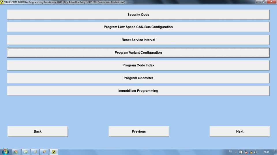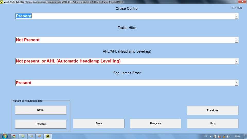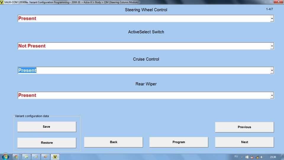 Нам понадобится изменить конфигурацию трех блоков, которые отвечают за работу круиз-контроля — это CIM, ECU, IPC. Перед программировнием конфигурации блоков, настоятельно рекомендую сохранить «Variant Configuration Data » для каждого модуля. Это позволит вернуть вам первоначальные настройки блоков, если что то пойдет не так. Подключимся к CIM модулю и изменим конфигурацию модуля Program -> Program Variant Configuration -> Security Code -> Cruise Control на значение Present и нажмем кнопку Program.