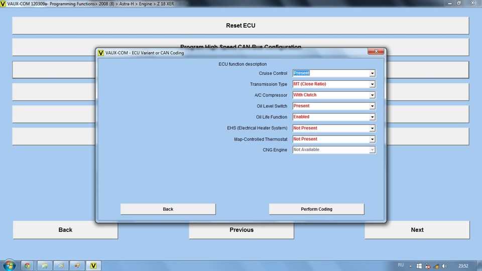 В поле Cruise Control меняем значение на Present и нажмем кнопку Perform Coding.