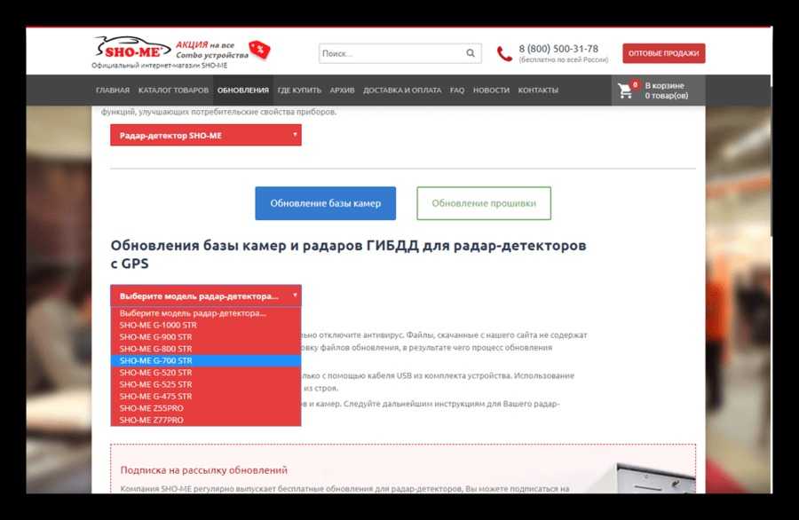 - Кликнуть на «Обновление базы камеры» и выбрать «Модель радар-детектора»