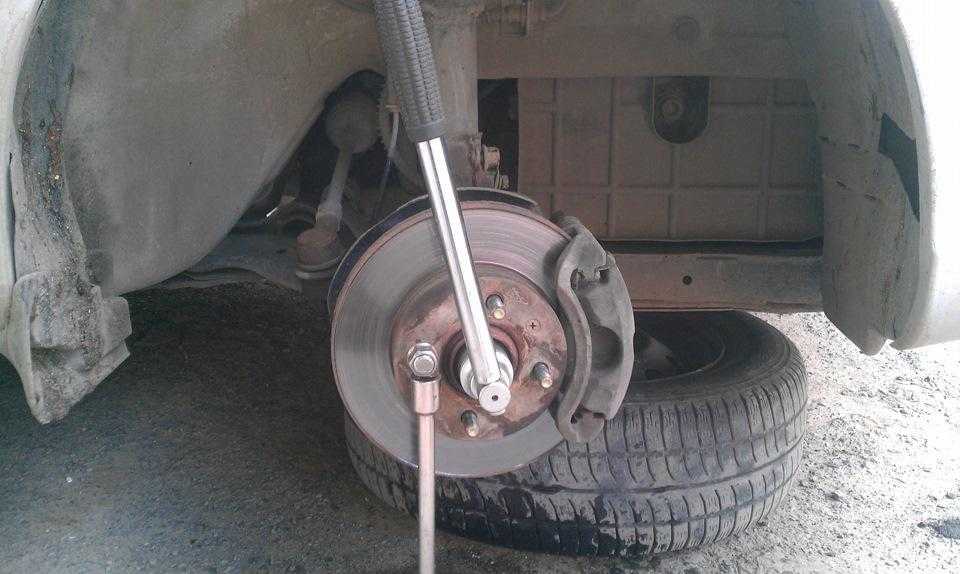 - На следующем этапе следует зафиксировать педаль тормоза. Сделать это можно при помощи деревянного бруска. Это нужно для предотвращения выпадения ступицы при ее демонтаже. Деталь останется удерживаться тормозными колодками.