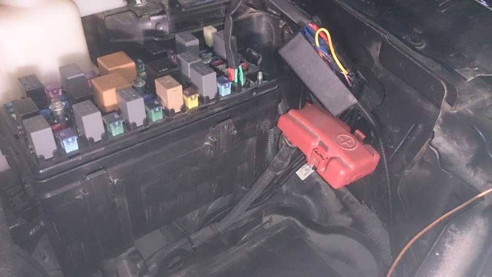 Блок предохранителей в подкапотном пространстве располагается между аккумуляторной батареей и бачком антифриза. Это чёрный ящик с крышкой, под которой и располагаются реле и предохранители.