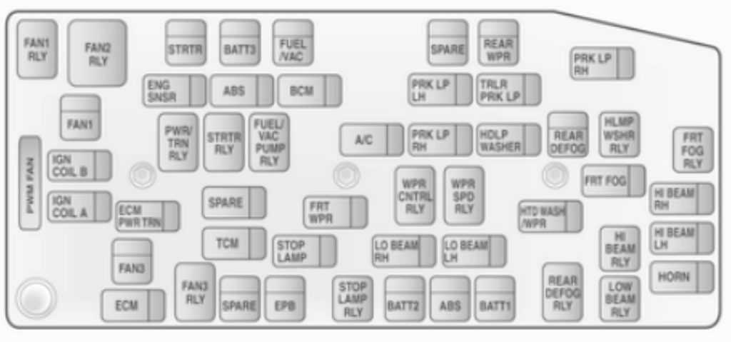 Схема расположения предохранителей в монтажном блоке, который находится под капотом Каптива: