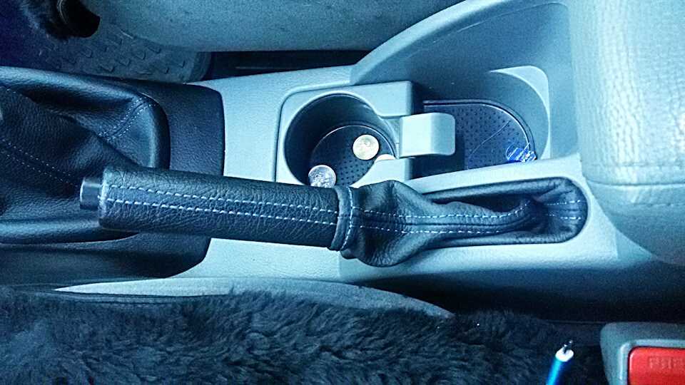 Для начала нам нужно максимально распустить тросы ручного тормоза. Для этого выковыриваем лючок в подстаканнике между передними креслами.