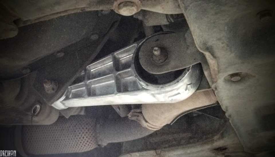 Первым делом подумал на заднюю подушку. Осмотрел её, она целая. На самом корпусе подушки есть вибрация, но она на кузов через больший сайлентблок не передается.