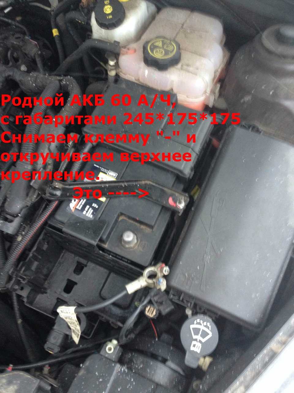 Снимите плюсовую клемму обратите внимание какая именно гайка на клемме ослабляется. Нажмите сбоку на защелки верхнего кронштейна АКБ, снимите