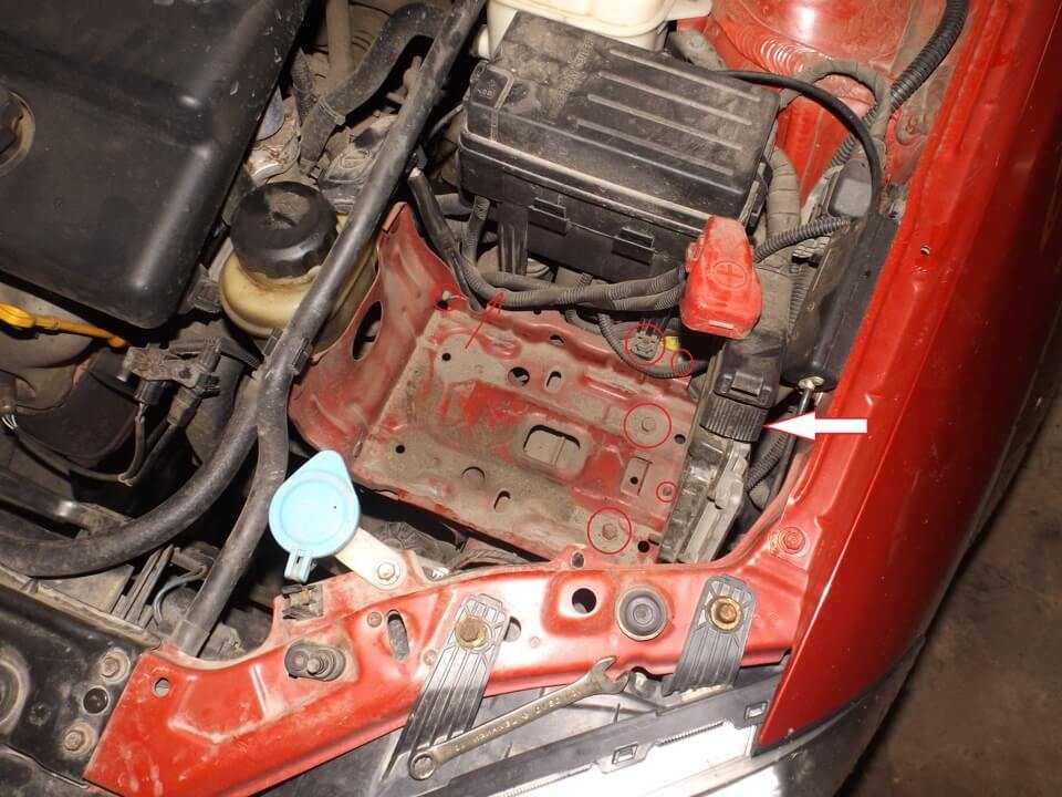 Перед началом замены необходимо отсоединить кабель отрицательной клеммы аккумулятора и удалить батарею, чтобы избежать короткого замыкания.