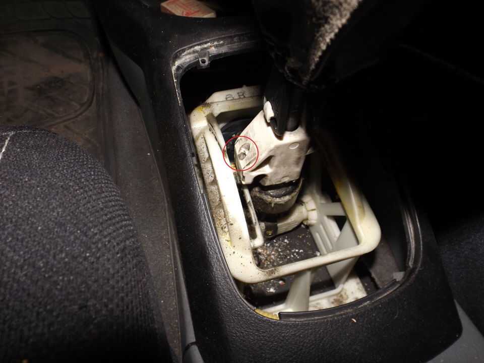 Приподнимаем чехол с рычага КПП, затем перемещаем рычаг влево до упора (не включая заднюю). И вставляем что-нибудь подходящее в расстояние между основанием рычага и внешним корпусом. Тем самым зафиксировав его в таком положении.