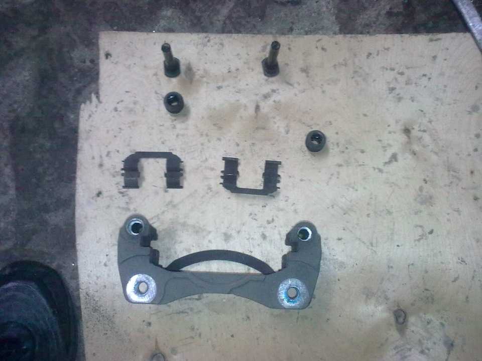 Возьмите щетку и очистите от коррозии и грязи посадочное место накладки и направляющей тормозных колодок. Прежде чем приступать к установке тормозных колодок следует проверить состояние резиновых пыльников на пальцах направляющих. Если обнаружите, что чехлы потеряли эластичность или порвались, то их стоит заменить. Для этого вытащите палец вместе с пыльником из отверстия направляющей. До момента установки пальца на место, вложите в отверстие направляющей небольшое количество пластичной смазки, а так же тонким слоем смажьте поверхность пальца.