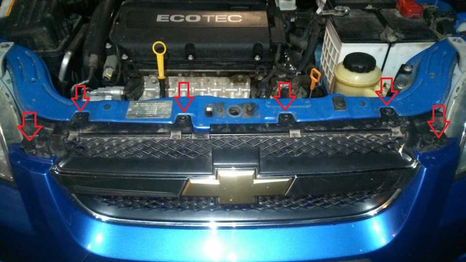 Открутите четыре болта крепления бампера к лонжеронам, используя ключ на После вытащите четыре пистона, которые прикрепляют верхнюю часть бампера Авео. Если их вытащить первыми, то понадобится помощник, которому придется придерживать крыло, чтобы после откручивания саморезов оно не упало.