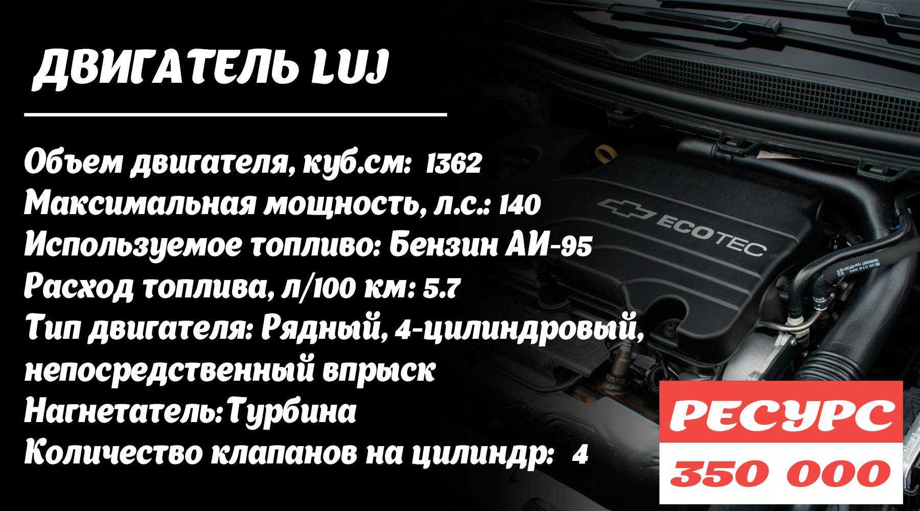 В 2012 году Chevrolet Cruze получил турбированный бензиновый мотор LUJ. Фактически агрегат является точной копией A14NET, который хорошо известен рядовым автолюбителям по модельному ряду Opel. Несмотря на общую конструктивную идентичность, некоторые отличительные особенности каждый из моторов имеет. Например, LUJ получил систему непосредственного впрыска топлива, когда в A14NET распределенный впрыск топливной смеси в цилиндры двигателя. За счет турбины невысокого давления (примерно 0.5 бар) обе установки снимают одинаковое число лошадиных сил – 140. Что касается его общей конструкции, то состоит LUJ из алюминиевого блока цилиндров с 16-клапанной головкой из легких материалов. Максимальный крутящий момент 200 Нм генерируется при достижении мотором 4900 оборотов в минуту. В качестве привода газораспределительного механизма выступает цепь. Она повышает надежность двигателя, следовательно, ресурс, но её не хватает на весь срок эксплуатации автомобиля.