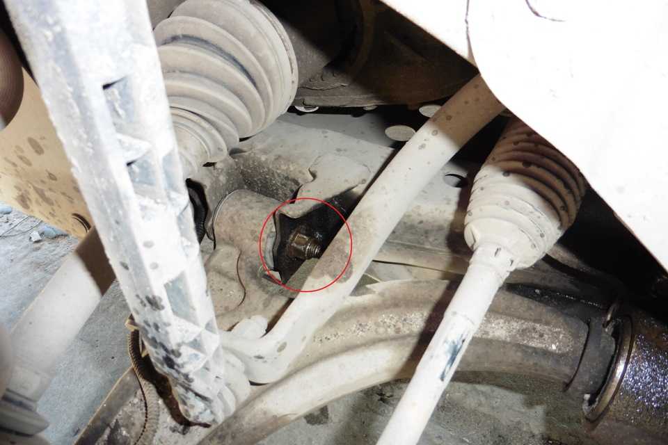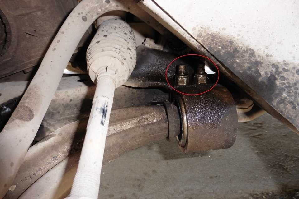 Затем ключами на 18 открутил гайку и вытащил болт переднего крепления рычага к подрамнику