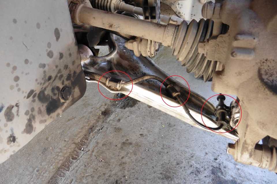 Домкратим машину, снимаем колесо и приступаем к работе. Перед началом которой главное не забыть отсоединить от рычага жгут проводов (фиксаторы обвел красным) от датчика частоты вращения колес: