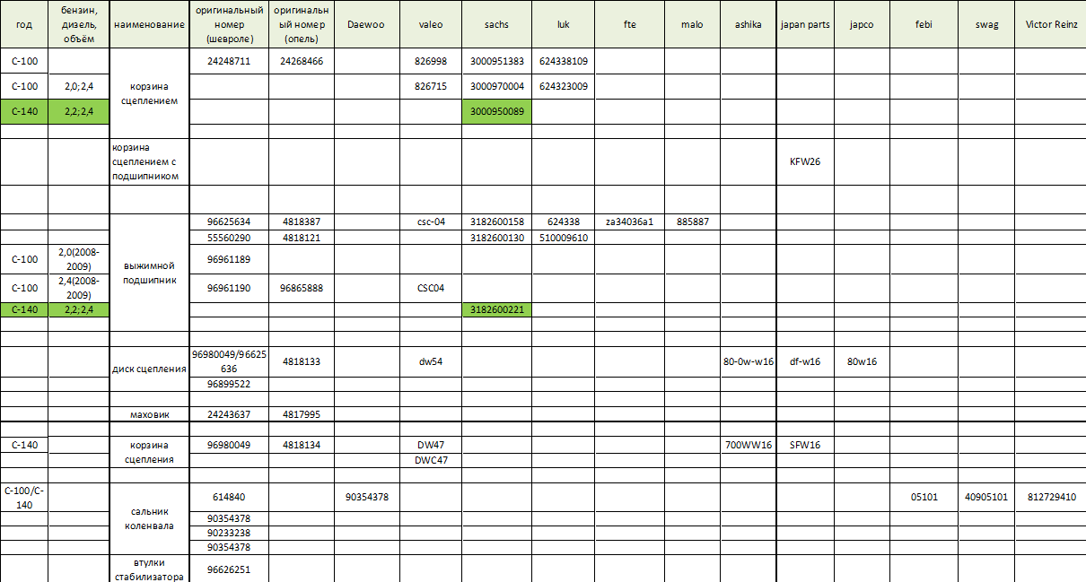 Сообщение TSVET » 06 июн 2015, 14:01 — Сцепление: сводная таблица (в качестве информации) , автор Уткевич Константин): — Сцепление на С-140 2.4 167 л.с. (отсюда, автор TSVET): — Сцепление на С-140 2.2 184 л.с. (отсюда): Сообщение CaBa » 06 июн 2015, 14:19 Думается, что всё-таки жидкость ушла. Не проверяли? 008 96961189 ЦИЛИНДР, ПРИВОД СЦЕПЛЕНИЯ L26 (MFU) 2010-2010008 96961190 ЦИЛИНДР, ПРИВОД СЦЕПЛЕНИЯ L26 (MFR) 2010-2010 Источник 96625636 ДИСК СЦЕПЛЕНИЯ, аналог по OPEL 4805570. Сообщение Viskant » 06 июн 2015, 14:58 Сообщение CaBa » 06 июн 2015, 15:02 Много долили? И как дело обстоит сейчас — опять уходит? Я просто к чему: если провалилось, то думаю вряд ли это диск сцепления. Он умирает обычно по-другому. Начинаются пробуксовки, растут обороты, а машина не едет. Но передачи при этом должны включаться исправно. Источник