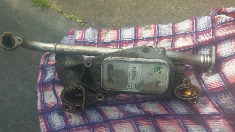 После снимаем и сам теплообменник (5 болтов крепят сам теплообменник + 4 болта крепят трубки). При снятии вытечет немного масла и антифриза.