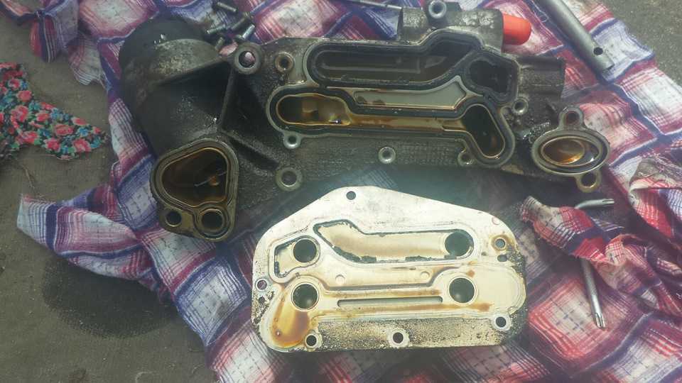 Течь маслоохладителя устраняется полной заменой всех прокладок и уплотнительных колец теплообменного узла. Всего необходимо будет заменить 12 уплотнительных элементов: