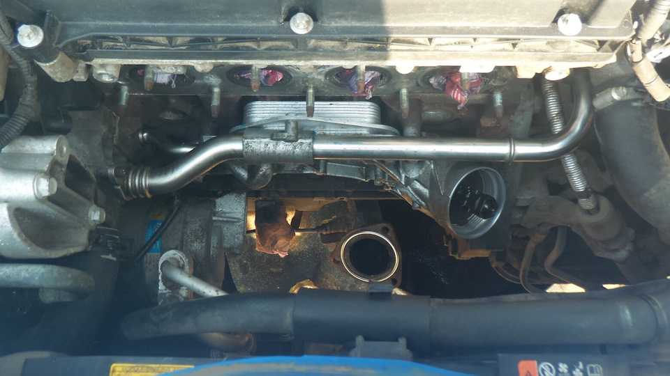 Работа по опрессовыванию маслоохладителя имеет средний уровень сложности. Чтобы добраться до теплообменника моторного масла необходимо демонтировать лишь термозащитный кожух и выпускной коллектор с катализатором.