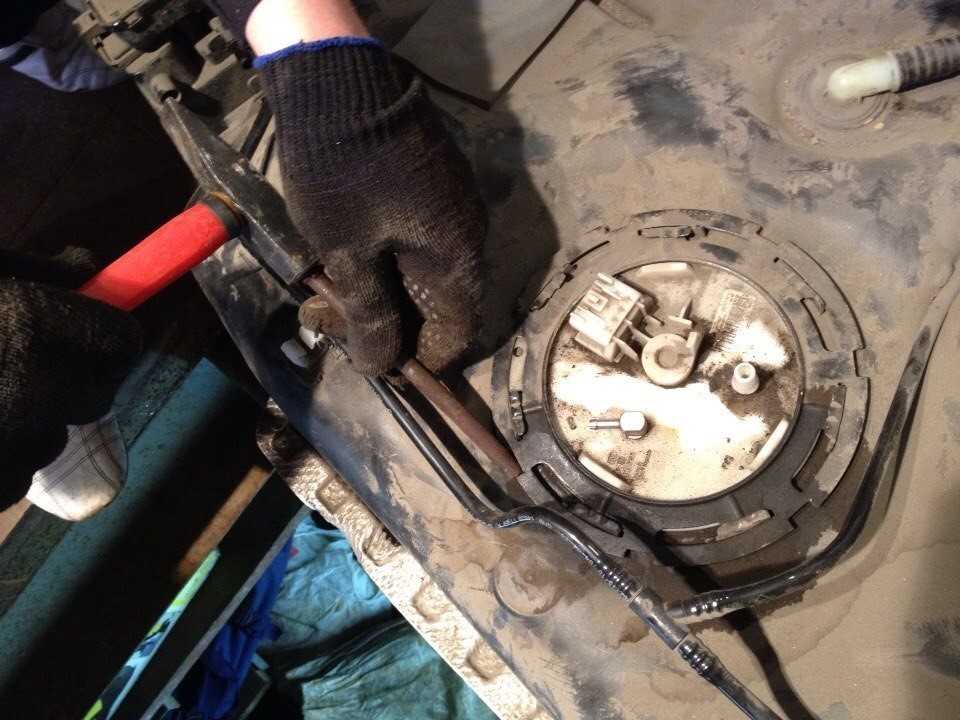 Но если его нет, то можете воспользоваться подручными инструментами, а именно отверткой и молотком. Когда у вас получилось открутить фиксирующий диск, аккуратно демонтируйте его и вытащите из места крепления сам насос. На самом бензонасосе вы увидите разъемы: На корпусе бензонасоса вы также увидите четыре защелки.