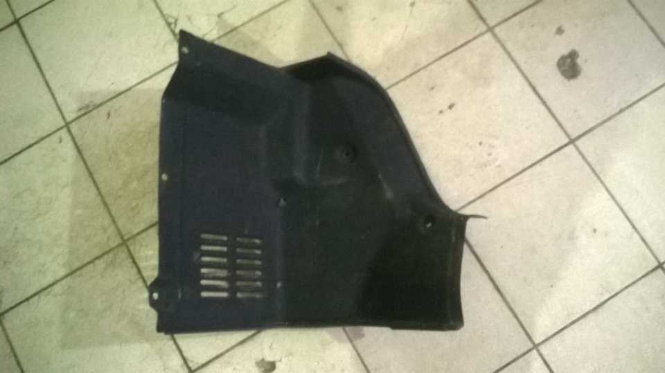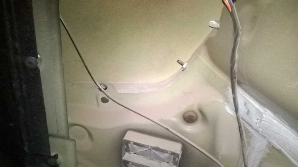 В багажнике и слева, и справа освобождаем от крепежей мягкую обшивку и отгибаем, чтобы получить доступ к крыльям изнутри. Там будут болт под ключ на 10″ и гайка.