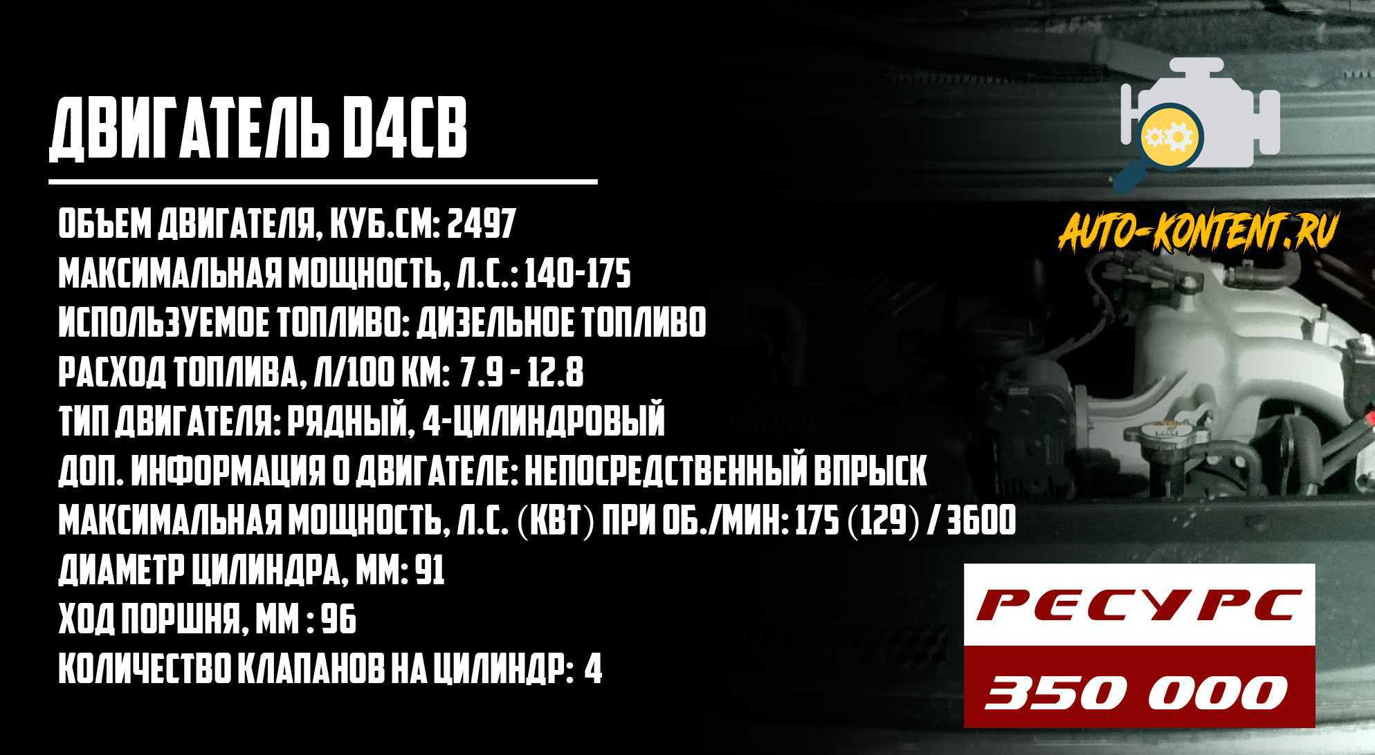 Агрегат D4CB имеет объем 2.5 литра, или 2497 куб. см. вес — 117 кг. Максимальный крутящий момент достигается при 2200 оборотах за минуту.