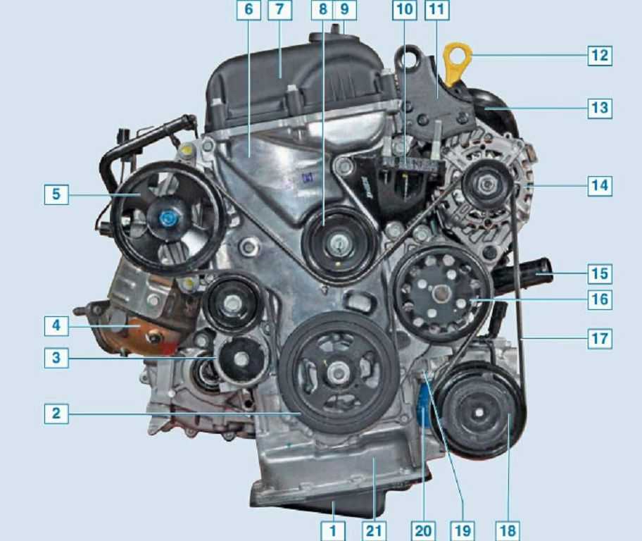Газораспределительный механизм (или ГРМ) отвечает за подачу в цилиндры сгорания топлива или воздуха, а также за удаление отработавших газов. Механизм ГРМ Хендай Солярис состоит из: