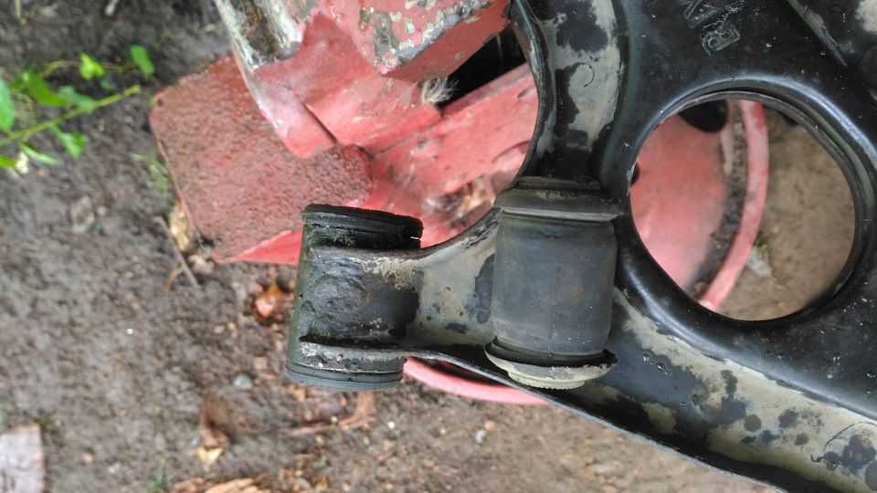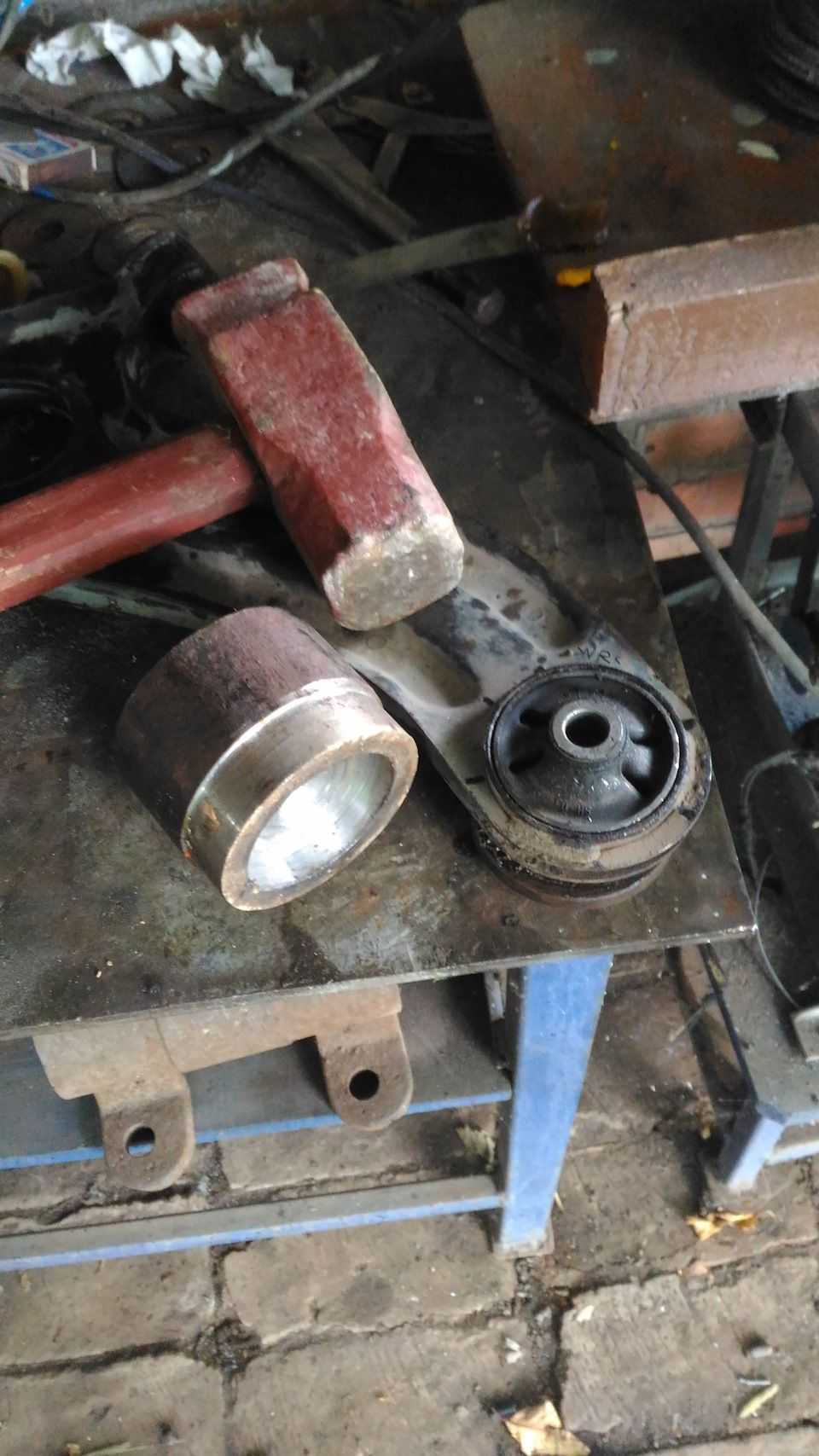 Зачищаются места для установки, и происходит запрессовка сайлентблока в рычаг. Если его не получилось сразу полностью установить на место, то рычаг располагается на ровной поверхности и происходит досадка элемента с помощью обычного молотка или небольшой кувалды. Делать это следует крайне аккуратно, чтобы не повредить только что установленные новые сайлентблоки.