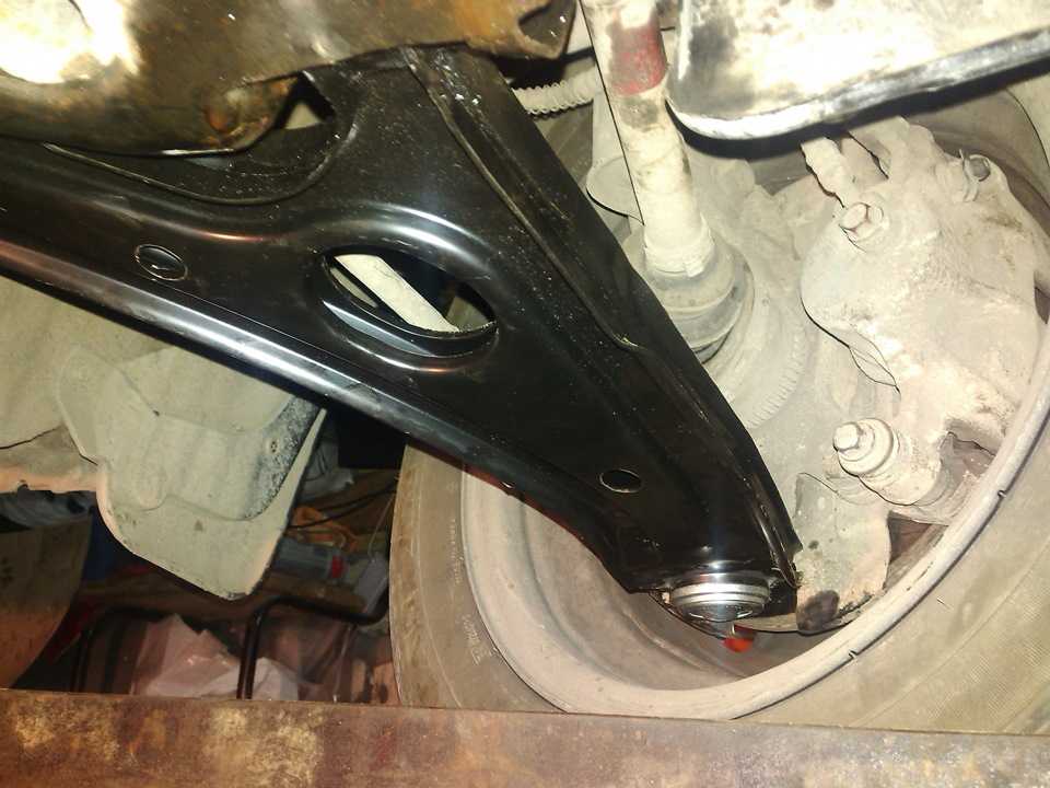 - Установить новую деталь в нижний рычаг, далее в кулак, после чего затянуть крепежи.