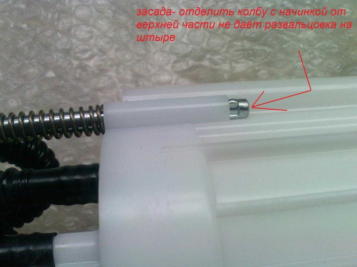 - Отжимаем фиксаторы на стержневых направляющих и стакан модуля топлива отсоединяем от крышки.