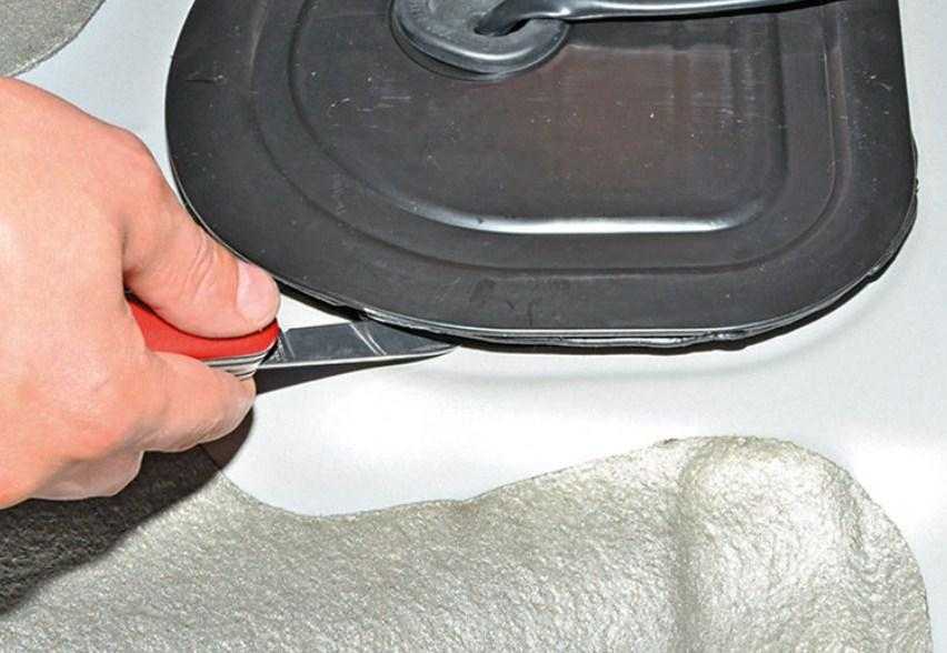 - Подрезать герметик ножом по квадрату крышки люка топливного модуля. Отвести крышку люка.