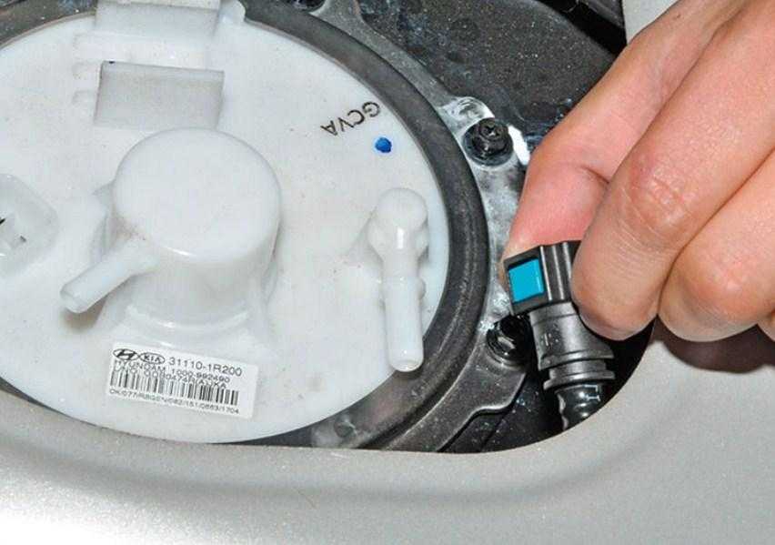 - Снять наконечник со штуцера крышки, нажав на фиксаторы трубки подачи топлива.