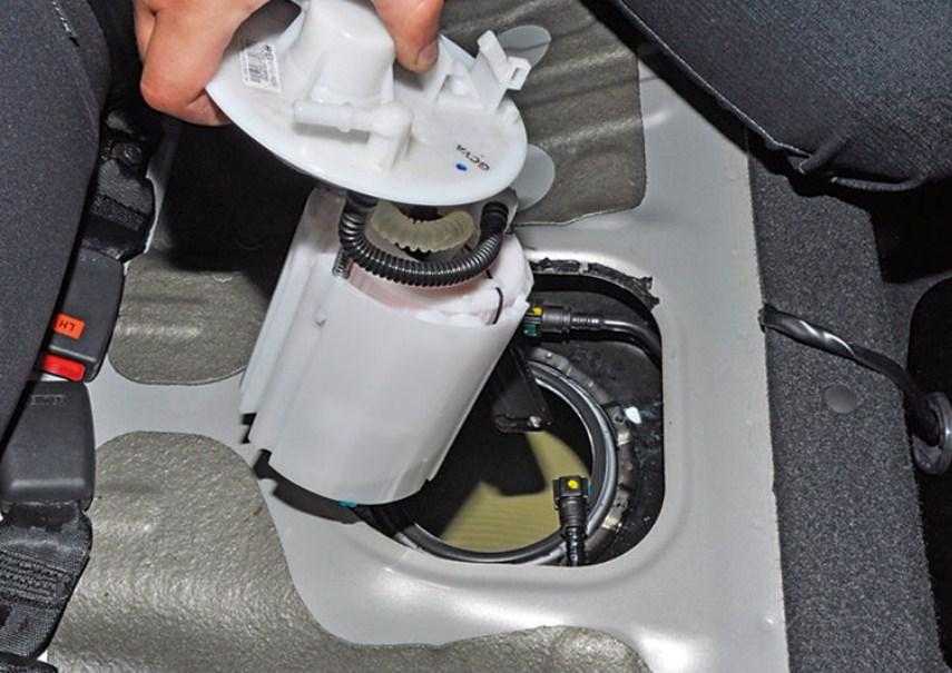 Топливный фильтр на Солярисе сблокирован с бензонасосом. Чтобы добраться до последнего, потребуется демонтировать заднее сиденье. Именно там, под специальной крышкой находится бензонасос, из блока которого извлекается топливный фильтр.