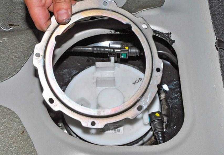 - Вынуть резиновое уплотнительного кольцо, которое герметизирует крышку топливного модуля и фланца отверстия бака.