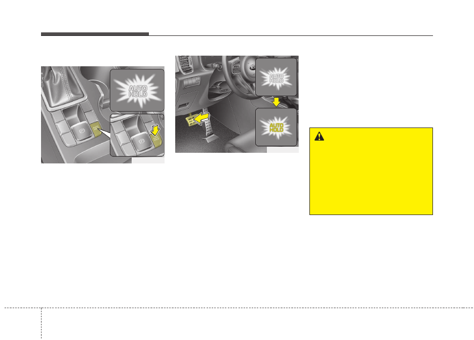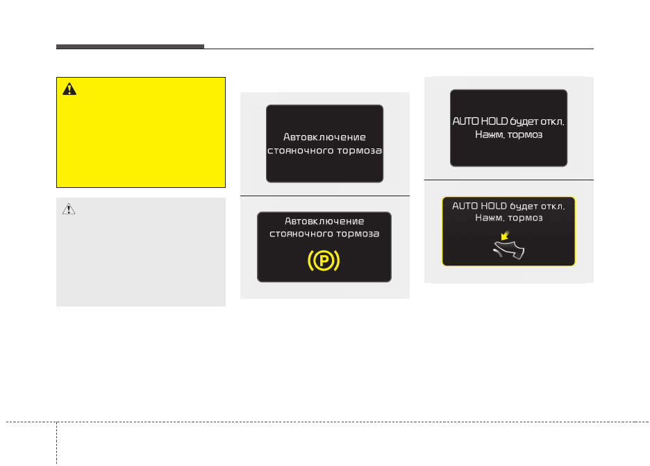 В этих случаях для сигнализации об автоматическом включении системы электрического стояночного тормоза загорается контрольная лампа тормоза, цвет индикатора “AUTO HOLD” меняется с зеленого на белый, звучит предупредительный сигнал и отображается сообщение. Перед поездкой нажмите педаль тормоза, проверьте дорожную обстановку вблизи автомобиля и отпустите стояночный тормоз вручную выключателем EPB.