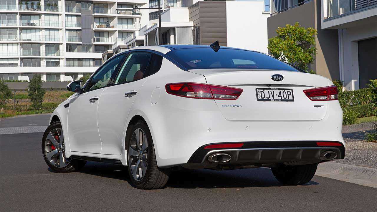 Задняя часть была очень сильно переделана и по мнению многих достаточно удачно. Рельефная крышка багажника оборудована небольшим спойлером. Оптика сзади узкая и оснащена светодиодной начинкой. Массивный бампер KIA Optima получил в нижнюю часть хромированную вставку, а с правой стороной расположился патрубок выхлопной системы. В других версиях может быть диффузор и два патрубка выхлопной системы.