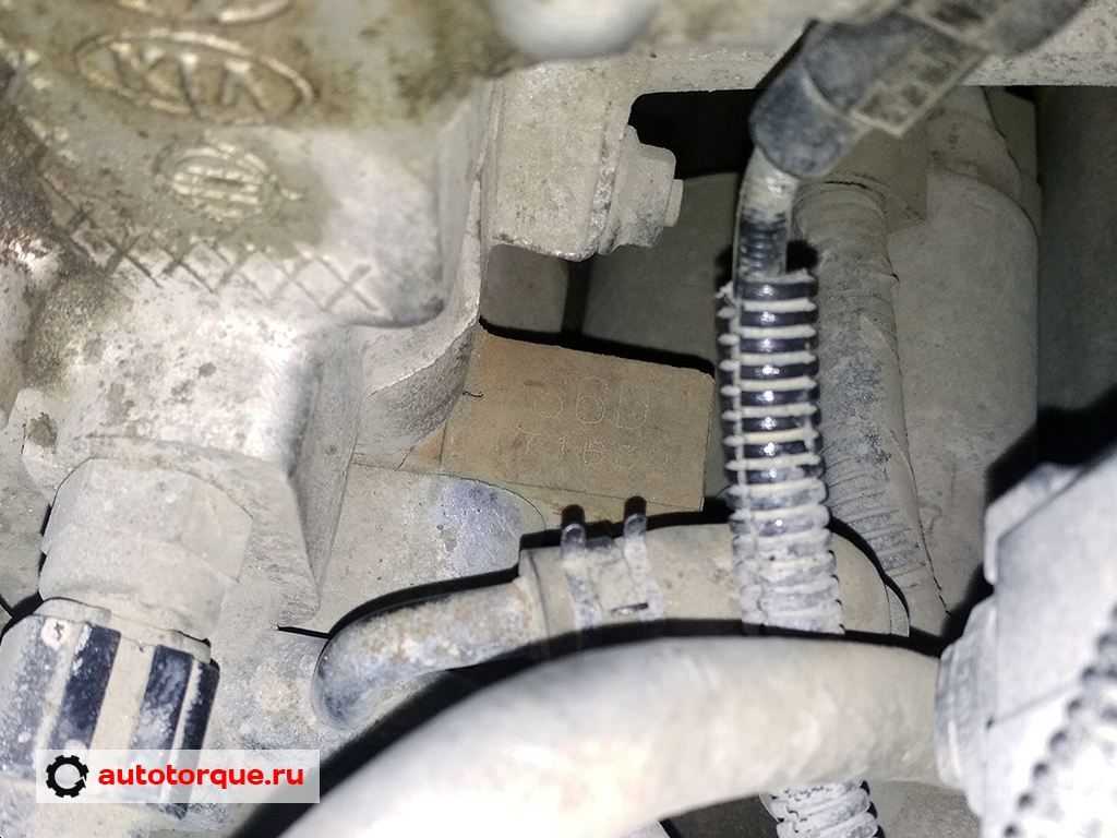 Номер двигателя Киа Рио находится на передней стенке выступа блока цилиндров под заливной горловиной охлаждающей жидкости.