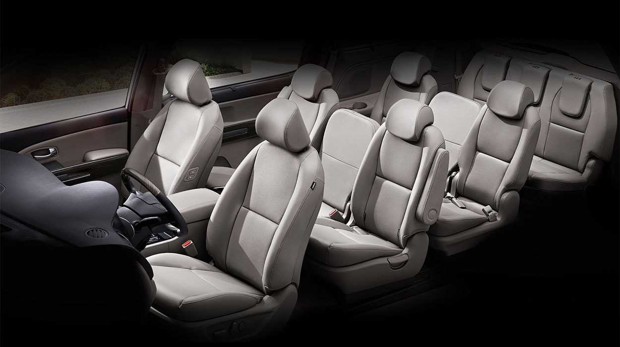 Салон корейского минивэна на 9 и 11 персон имеет следующие посадочные формулы: 2+2+2+3 и соответствен 2+3+3+3. Девяти местная конфигурация салона Kia Karnival во втором и третьем ряду имеет отдельно установленные сидения, одиннадцати местная конфигурация салона больше напоминает автобусный салон.