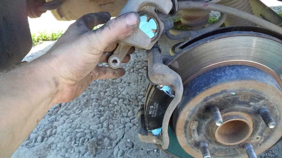 Далее вынимаем из пазов старые колодки, с помощью металлической щетки очищаем скобу и посадочные места колодок от мусора и пыли. Затем устанавливаем новые колодки.