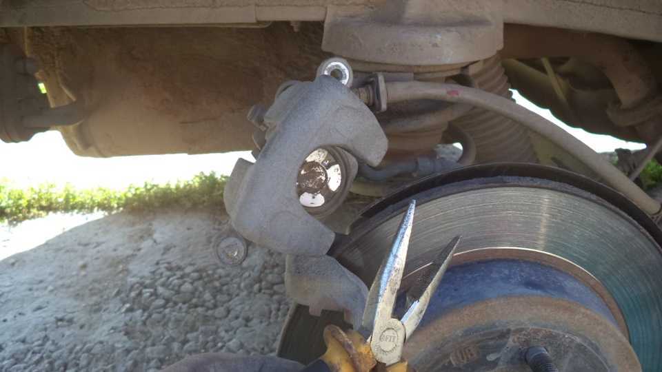 Чтобы установить скобу суппорта на место, потребуется утопить поршень в глубь цилиндра. Если в случае передних колодок он просто утапливается, то на задних суппортах поршень нужно крутить по часовой стрелке. Делается это при помощи круглогубцев или подручный средств.