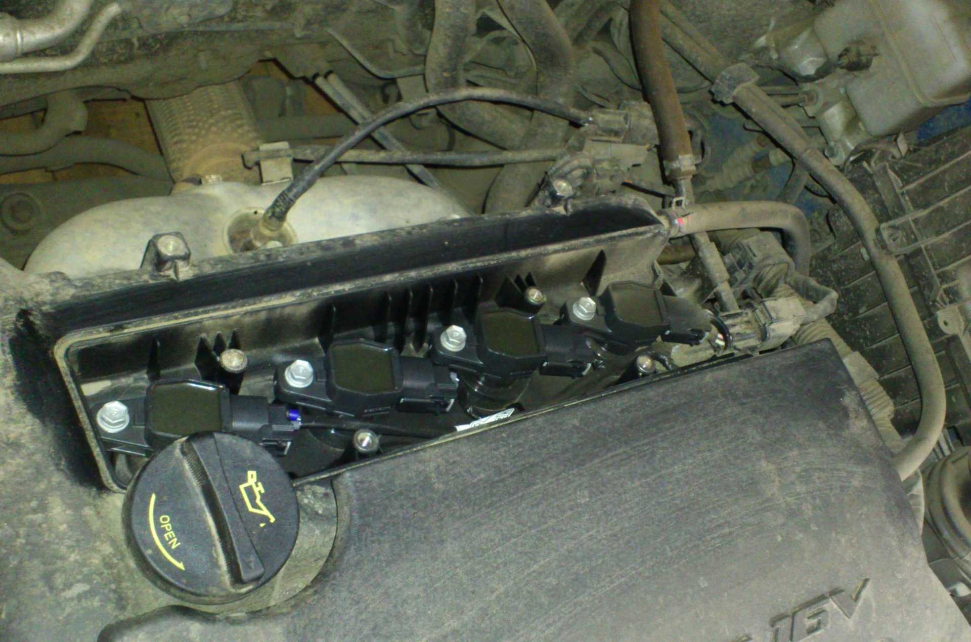 2. Под крышкой обнаруживаем катушки зажигания: по одной для каждой свечи. Каждая катушка крепится одним болтом также на 10. С помощью головки откручиваем 4 болтика и аккуратно извлекаем катушки из свечных колодцев.