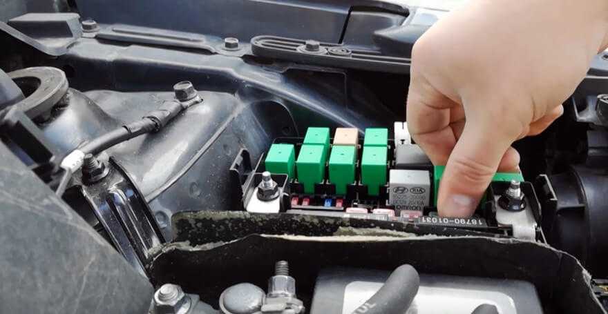 Для начала необходимо сбросить давление в топливной системе, поскольку под давлением категорически запрещается разгерметизировать топливопроводную магистраль. Давление сбрасывается просто. Для этого находим реле бензонасоса в монтажном блоке, который находится под капотом. Нужное нам реле — крайнее в левом углу. Вынимаем реле из платы и запускаем двигатель.