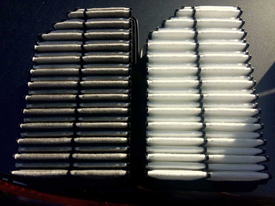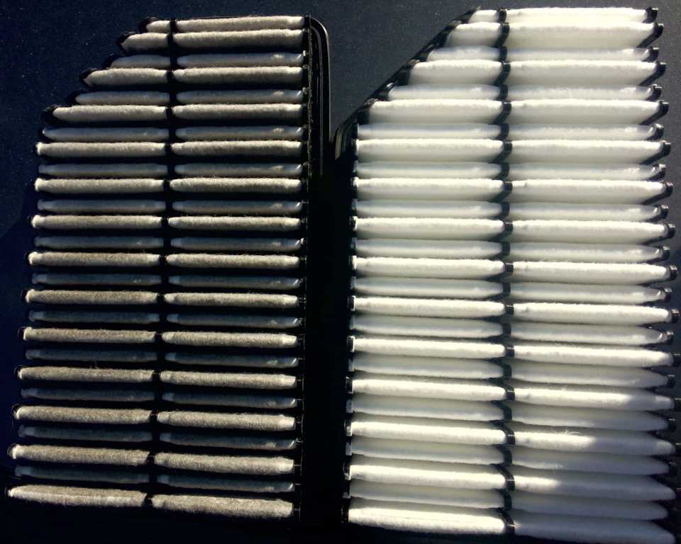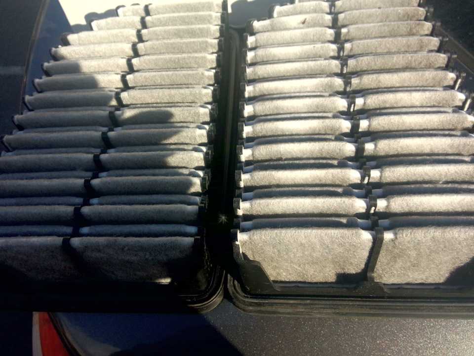 На фото ниже можно видеть разницу между старым и новым фильтрами. Показана сторона, которая обращена к двигателю. Наглядно можно убедиться, что старый элемент не будет уже качественно очищать воздух.