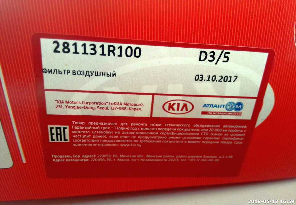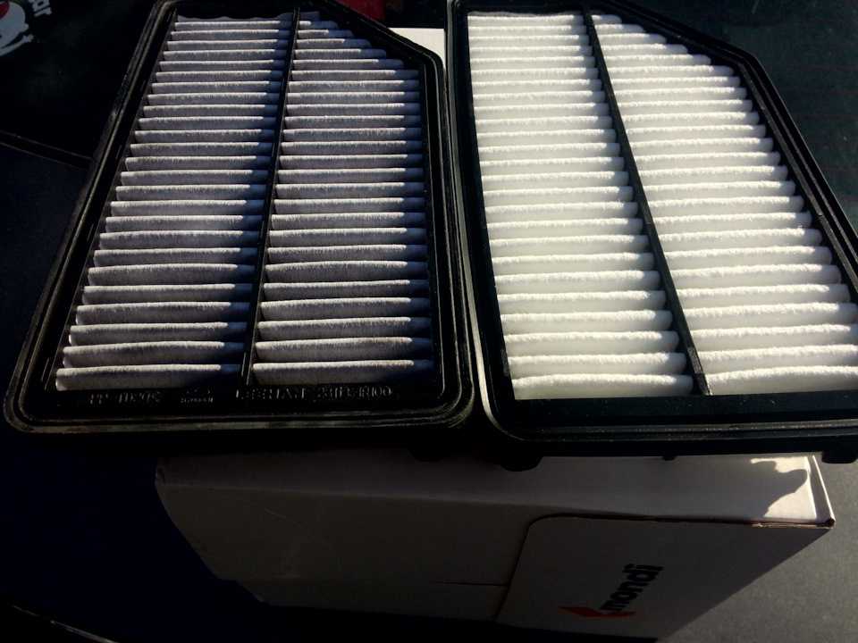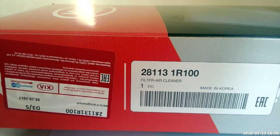 Как проверить годность фильтра?Основная теорема/аксиома — Если с обратной стороны (на выходе очищенного воздуха) появились черные точки пыли, то фильтр пора менять безотлагательно. Это уже отработанный материал.———————————————————————————————————————————————Во первых28113 1R100 Оригинальный воздушный фильтр. Made in KoreaКогда мы были молодыми и необстрелянными, на гарантии… На официальном ТО, по крайней мере у нас ставили вот такие. Красивенная коробка, гордое «Made in Korea» и цена около 15 баксов…Всего-то… Ну а как-же цветная полиграфия, доставка такого объема коробки из Кореи… Ну и сам фильтр в 5 баксов условно…