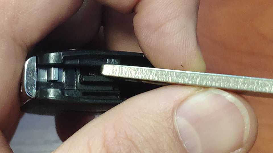 В качестве помощника можно использовать тот самый металлический мини-ключик. Вставляем его в прорезь в торцевой части брелка: