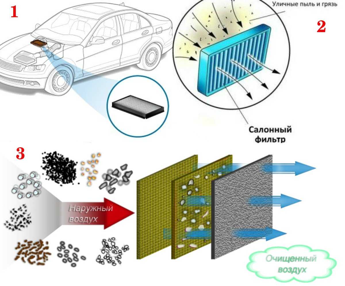 Сам фильтр представляет собой мембрану, ткань, которая сложена в виде гармошки, или уложена слоями. Между слоями материала может быть нанесен угольный порошок, или использованы угольные вставки. Воздух, проходя через фильтр, проходит очистку, после чего попадает в салон автомобиля. В зависимости от используемого фильтра степень очистки воздуха может меняться.