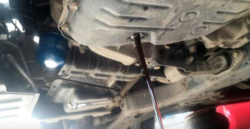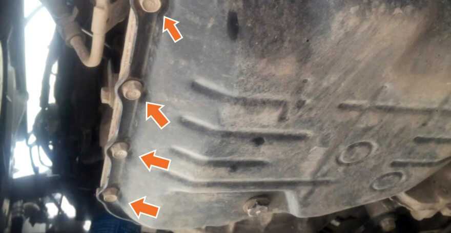 1. Поднимаем автомобиль на подъемнике. Двигатель и АКПП должны быть прогреты до рабочей температуры. 2. Если необходимо, то снимаем защиту двигателя, чтобы подобраться к картеру АКПП.