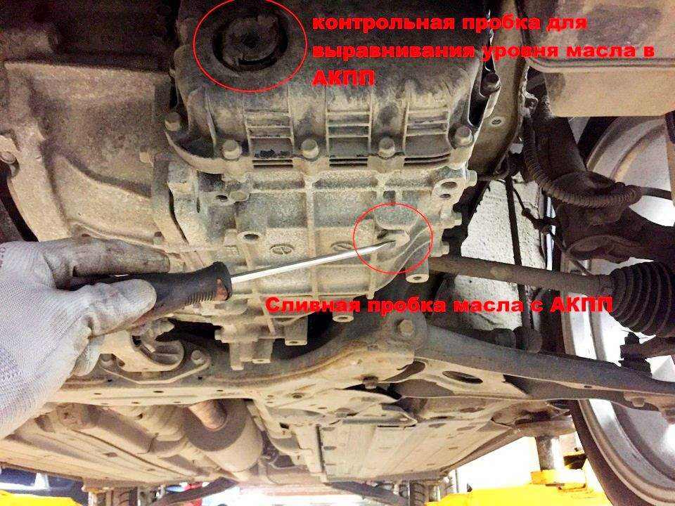 Рекомендуется проехать на автомобиле несколько километров, чтобы жидкость прогрелась и лучше стекала через сливное отверстие. Работы необходимо проводить на автомобильном подъемнике, смотровой яме или эстакаде, дающих доступ к нижней части коробки передач. При наличии защиты ДВС, мешающей проведению работ — снять защиту, по окончании работ установить обратно.